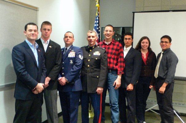 The Hamilton Society E-Board with the speakers, left to right: Austin Byrd, Kelley Victor Gasper, SSG Jason Kimberling, CPT John Sand, Riaz Anderson Zaidi, Jordan Peeples, Elizabeth Feldmeier, Marc Fitorre.