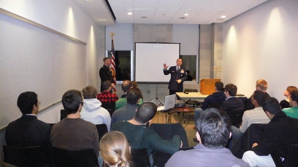 The 25 February 2008 event is described in a Columbia Spectator article "Military Men Reflect on Careers, Motivations". The bottom photo shows the Hamilton Society E-Board with the speakers.