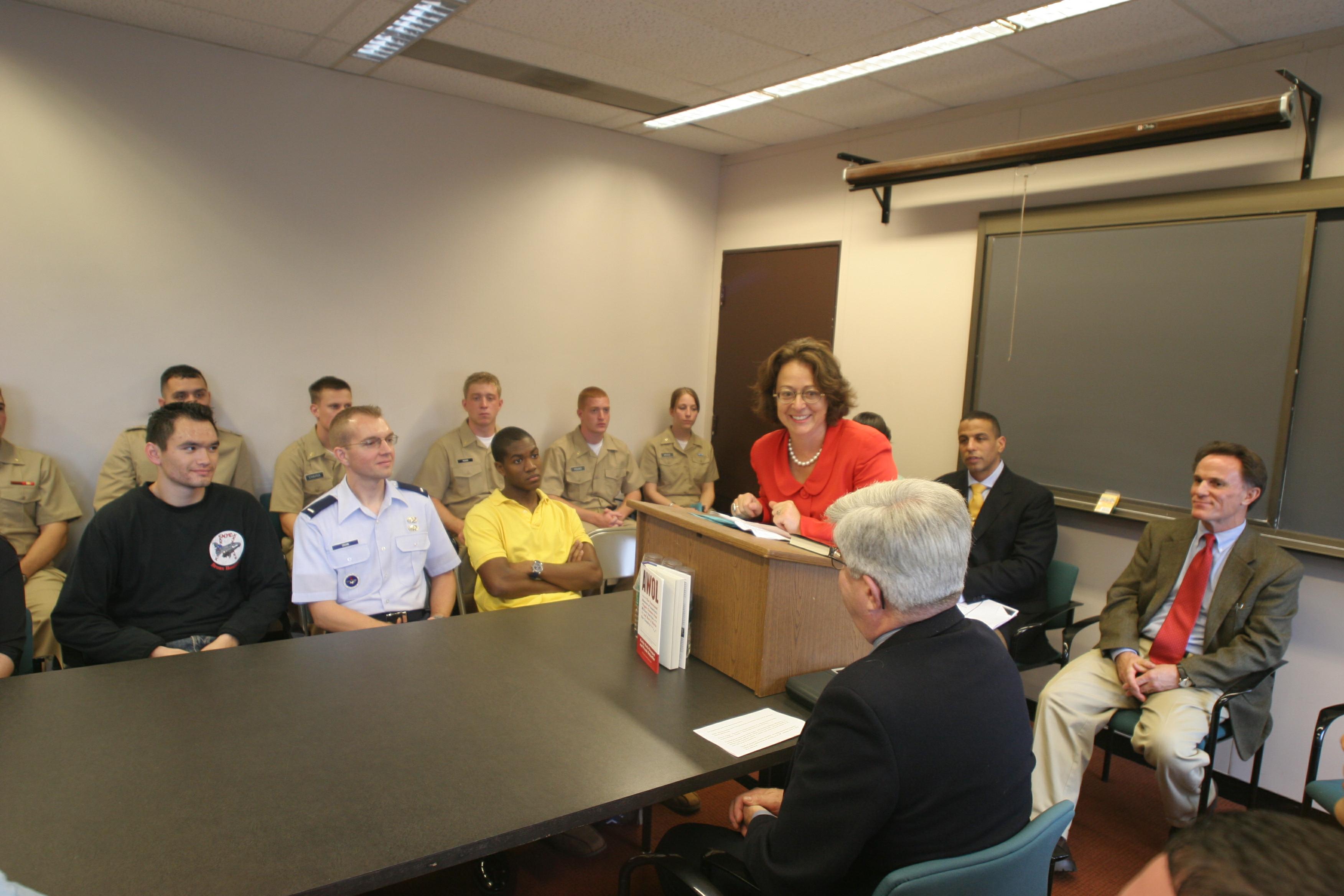 Prof. Richard Betts (back) shares a light moment with Kathy Roth-Douquet while Matt Sanchez (rear-left) and Frank Schaeffer look on.