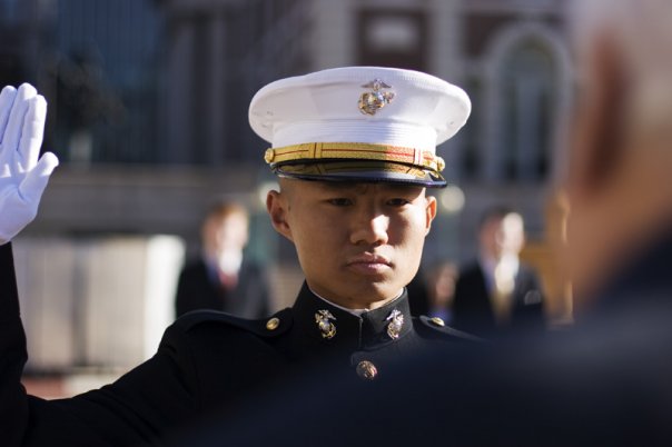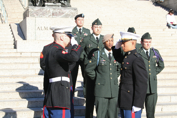 Oscar Escano, Army MAJ Taylor Hwong, Marine Cpl Dan Cross, who rendered Lt Xue’s first salute, Marine Cpl Matt Sanchez, Hamilton Society Vice-President